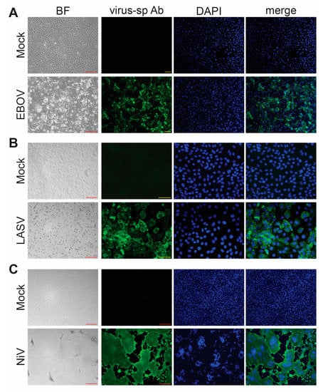 Virus detection. Brightfield (BF) microscopy and immunofluorescence analysis (IFA) of Vero E6 cells infected with (A) EBOV, (B) LASV, or (C) NiV. The infected cells show clear CPE under BF microscopy. Green, virus-specific antibody (virus-sp Ab) staining; blue, cell nuclei stained with DAPI. Red scale bars = 200 µm; yellow scale bars = 50 µm.