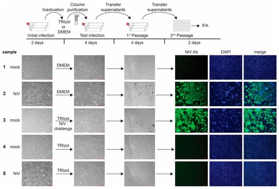 To test the ability of TRIzol (Thermo Fisher Scientific, Waltham, MA, USA) to inactivate EBOV-, NiV-, or LASV-infected cells, Vero E6 cells seeded in T175 flasks were mock-infected or infected with the respective virus (see Table S1 for virus-specific conditions). The progress of the infection was monitored by analyzing fluorescence and/or CPE. At the indicated days post-infection (Figure S1), when complete infection of cells or pronounced CPE was observed, cell supernatants were removed, and the cells were scraped into 20 mL of PBS (phosphate-buffered saline; Thermo Fisher Scientific, Waltham, MA, USA), transferred into tubes, pelleted by low-speed centrifugation, and resuspended in 1 mL PBS or DMEM or TRIzol. To determine the cell number of the T175 flasks at the time of inactivation, an extra flask with cells was incubated for the same time and used to count the cells. The PBS/DMEM and TRIzol samples were vortexed, incubated for 10 min at room temperature, and purified using size exclusion columns (Amicon Ultra-0.5 Centrifugal Filter Unit 10 kDa; Millipore-Sigma, Burlington, MA, USA), as previously described []. The samples were eluted in 0.5 mL of PBS. The entirety of the used column eluates was used to infect 2 × 107 Vero E6 cells seeded in T175 flasks. For the challenge samples, the respective virus was mixed with the column-purified eluate from TRIzol-treated non-infected cells and used to infect cells (see Table S1 for virus-specific conditions). Flasks were incubated for the indicated times (Figure S1) and checked for signs of fluorescence and/or CPE every 2–3 days. Cell supernatants were clarified by low-speed centrifugation, and the entire supernatant was used to infect Vero E6 cells seeded in T175 flasks. The flasks were checked for CPE every 2–3 days. At the indicated days post-infection (Figure S1), cell supernatants were clarified by low-speed centrifugation, and 0.2 mL was used to infect Vero E6 cells seeded in a 96-well plate. Three days post-infection, the cells were fixed with 10% formalin, and immunofluorescence analysis using virus-specific antibodies was performed to determine infection rates.