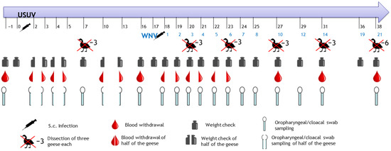 Reemtsma H, Holicki CM, Fast C, Bergmann F, Groschup MH, Ziegler U. A Prior Usutu Virus Infection Can Protect Geese from Severe West Nile Disease. Pathogens. 2023; 12(7):959. https://doi.org/10.3390/pathogens12070959