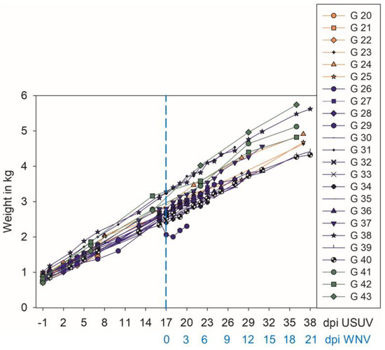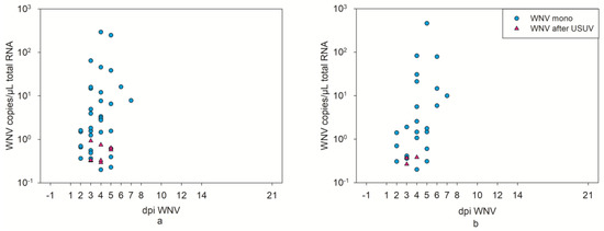 | G 27, 28, 34 | USUV | WNV | 23 dpi USUV and 6 dpi WNV |