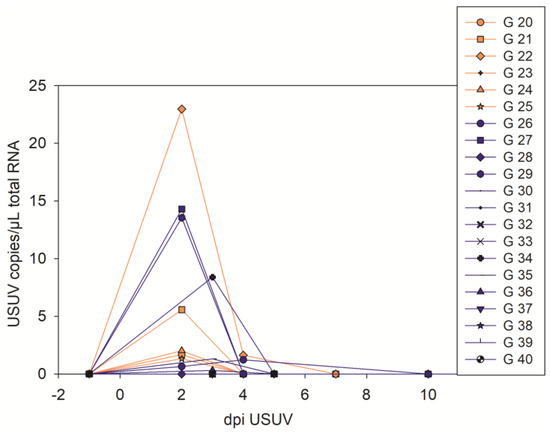 | G 20–22 | USUV | No virus | 7 dpi USUV |