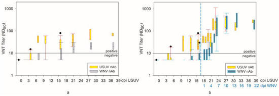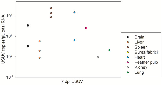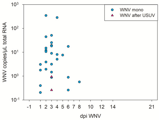 | G 29–31 | USUV | WNV | 27 dpi USUV and 10 dpi WNV |