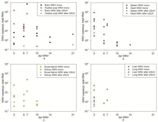 | G 35–37 | USUV | WNV | 31 dpi USUV and 14 dpi WNV |