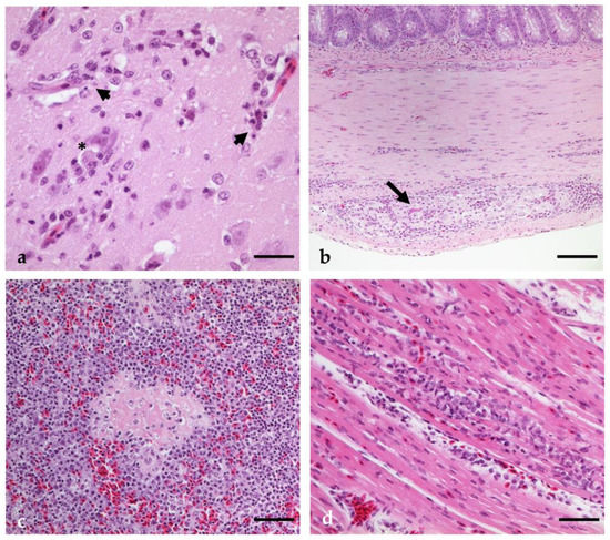 - Agliani, G.; Giglia, G.; Marshall, E.M.; Gröne, A.; Rockx, B.H.; van den Brand, J.M. Pathological features of West Nile and Usutu virus natural infections in wild and domestic animals and in humans: A comparative review. One Health 2023, 16, 100525. [Google Scholar] [CrossRef]