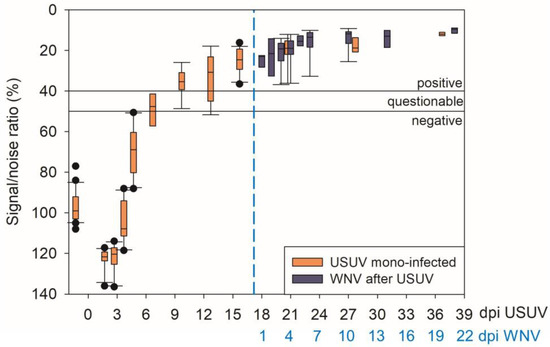 | G 38–40 | USUV | WNV | 38 dpi USUV and 21 dpi WNV |