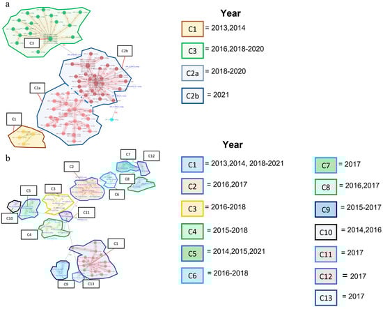 The minimum spanning tree analysis revealed three allelic main clusters for ORT (Cluster 1, n = 4; Cluster 2, n = 70, and Cluster 3, n = 23; Figure 1a). Six isolates were classified as singletons (i.e., could not be classified within any of the existing three clusters). Cluster 2 contained subgroupings of isolates below the preset allelic threshold and was therefore divided into two distinct subclusters (C2a, n = 28, and C2b, n = 42; Figure 1a). For PM, the minimum spanning tree analysis revealed 13 distinct clusters (Figure 1b).