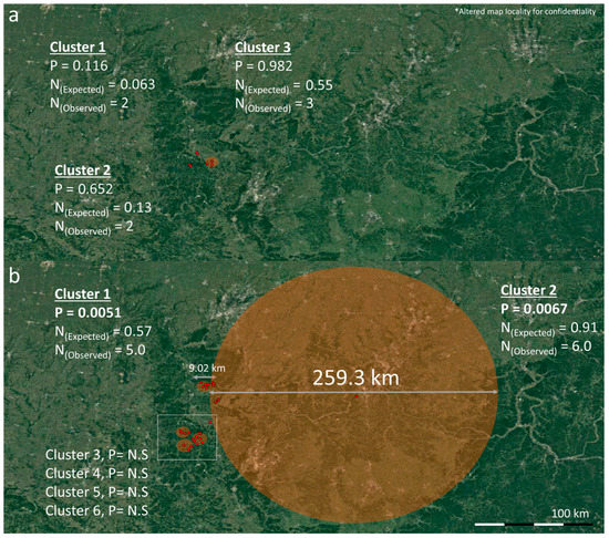 A spatio-temporal cluster analysis was performed using SaTScan™ software, version 10.1 (SaTScanTM, Boston, MA, USA, http://www.satscan.org accessed on 27 July 2023), using a Kulldorff retrospective space–time permutation probability model with a circular scanning window across space and time for high incidence rates. Cases were analyzed on a monthly level to identify ORT and PM clusters using confirmed positive cases across between 2013 and 2021 [40]. The number of observed cases within a cluster were compared to the distribution of expected cases with the null hypothesis being based on that spatial and temporal location of all cases being independent. All models were fitted and evaluated through Monte Carlo simulations (999 replications). The site coordinates were used as spatial information and the maximum size of a spatial cluster was determined as 50% of the population at risk and 50% of the study period. p-values < 0.05 were considered statistically significant.