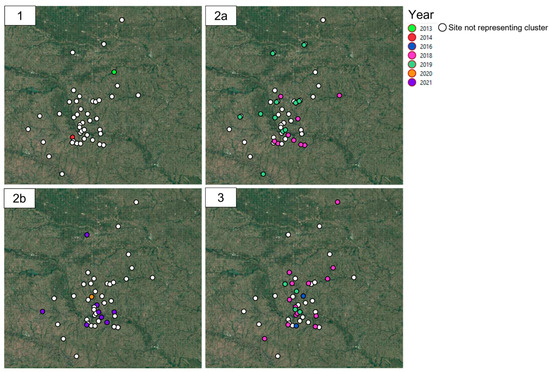 Spatial visualization of confirmed outbreaks of Ornithobacterium rhinotrachealis by year (2013–2021) and cluster (1, 2a, 2b, and 3) identified based on the allelic profile of a 1250 single-copy core genome target and an allelic cut-off value of >50 using the open-source geographic information system software QGIS 3.22.16. Each panel represents one genetic cluster type.