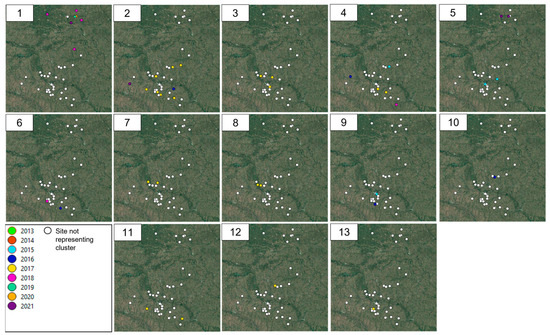 Spatial visualization of confirmed outbreaks of Pasteurella multocida by year (2013–2021) and cluster (1–13) identified based on the allelic profile of a 1259 single-copy core genome target and an allelic cut-off value of >120 using the open-source geographic information system software QGIS 3.22.16. Each panel represents one genetic cluster type.