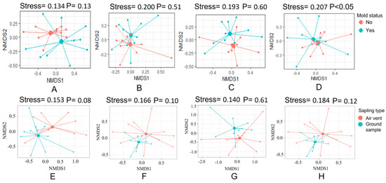 - Cox, J.; Stone, T.; Ryan, P.; Burkle, J.; Jandarov, R.; Mendell, M.J.; Adams, R.I.; Niemeier-Walsh, C.; Reponen, T. Associations of observed home dampness and mold with the fungal and bacterial dust microbiomes. Environ. Sci. Process. Impacts 2021, 23, 491–500. [Google Scholar] [CrossRef]