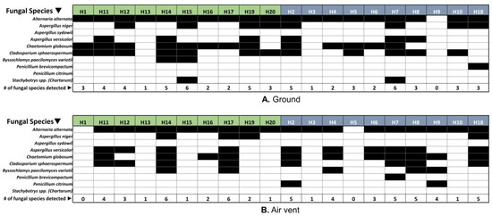 3.1. Data Showed the Presence of Several Pathogenic Bacterial and Fungal Genera with Distinctive Patterns in the Ground versus Air Vent Dust