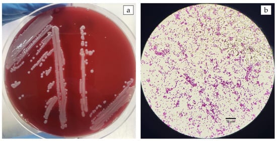 Morphological characteristics of Aeromonas veronii isolated from a disease outbreak in Nile tilapia farmed in Brazil. (a) Bacterial culture on BHI agar from diseased fish tissues collected in the field. Presence of pinhead-sized, semitransparent, yellowish, flattened colonies. (b) Gram-negative bacilli under a light microscope (Scale bar 10 μm).
