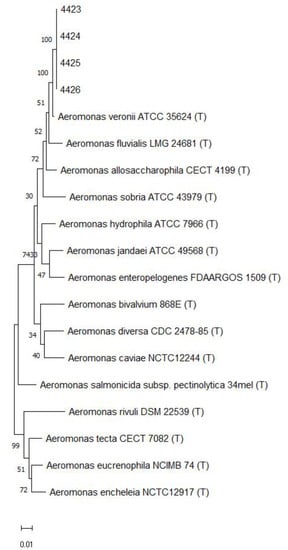 - Fernández-Bravo, A.; Figueras, M.J. An Update on the Genus Aeromonas: Taxonomy, Epidemiology, and Pathogenicity. Microorganisms 2020, 8, 129. [Google Scholar] [CrossRef] [PubMed]