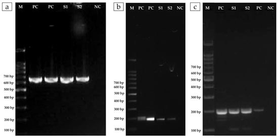 Genomic DNA was extracted using a MagMAX™ CORE Nucleic Acid Purification kit (Thermo Fisher Scientific Inc., São Paulo, SP, Brazil) according to the manufacturer’s recommendations. Then, tissue was homogenized in PBS solution (pH 7.4), agitated in L-Beader 24 disruptor (Loccus do Brasil Ltd.a., Cotia, SP, Brazil), centrifuged at 1000× g for 2 min, and automatically extracted using KingFisher™ Duo prime system equipment (Thermo Fisher Scientific Inc., São Paulo, SP, Brazil) according to the manufacturer’s protocol. PCR reactions consisted of 10 µL of 5X PCR buffer, 1 µL of forward primer (10 µM), 1 µL of reverse primer (10 µM), 1 µL of dNTPs (10 mM), 0.2 µL of GoTaq DNA polymerase (5 U/µL Promega), and 36.8 µL of autoclaved MilliQ H2O.