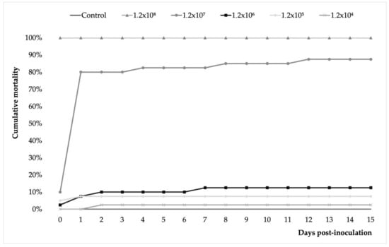 The results showed that the A. veronii isolate tested was pathogenic in juvenile Nile tilapia with dose-dependent mortality rates and a degree of pathogenicity. The mortality rate ranged from 3 to 100% in the lowest (1.2 × 104) and highest (1.2 × 108) in the bacterial dose groups (Figure 4). In the 1.2 × 107 group, cumulative mortality reached 10% before the first 24 h after inoculation. Thereafter, cumulative mortality rapidly reached 80% at 48 dpi and continued with a milder increase to 83% at 4 dpi, 85% at 8 dpi, and 88% at 12 dpi and until the end of the trial. Fish in the 1.2 × 106 group showed a similar pattern of cumulative mortality but with significantly lower values. Like this, cumulative mortality registered 10% at 48 h post-inoculation and 13% at 7 dpi, a rate that remained unchanged until the end of the challenge. No mortality was recorded in the control group.