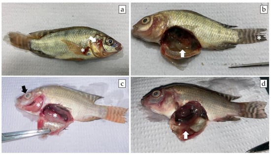 Gross pathology findings in juvenile Nile tilapia experimentally infected by A. veronii isolate obtained and characterized from a disease outbreak in a commercial net cage farm in the state of Sao Paulo, Brazil. (a) Opercular hemorrhage (white arrow) and hemorrhage at the base of the fins (white asterisk) (Group 1.2 × 106); (b) Intestine filled with transparent fluid (white arrow) and ragged edges to the caudal fin (white asterisk) (Group 1.2 × 105); (c) Ocular opacity (black arrow), pale gills, and visceral organs (white asterisk) (Group 1.2 × 105); (d) Ascites (Group 1.2 × 104).
