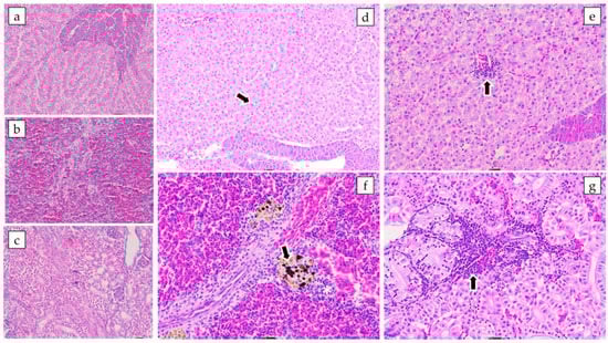 Microphotographs of juvenile Nile tilapia tissues experimentally infected with a pathogenic strain of Aeromonas veronii. Haematoxylin-eosin staining. Microscopic tissue changes were often mild to moderate and particularly in infected fish with lower bacterial loads: (a) No microscopic changes in the liver. Scale bar 50 μm; (b) No microscopic changes in the spleen. Scale bar 20 μm; (c) No microscopic changes in the kidney. Scale bar 20 μm; (d) Liver (Group 1.2 × 106). Diffuse vacuolar depletion (arrow). Scale bar 20 μm; (e) Liver (Group 1.2 × 105). Focal mononuclear inflammatory infiltrate (arrow). Scale bar 20 μm; (f) Spleen (Group 1.2 × 105). Hyperplasia of melano-macrophage (arrow) centers and lymphoid hyperplasia (white asterisk). Scale bar 20 μm; and (g) Kidneys (Group 1.2 × 104). Focal interstitial leukocyte infiltrate (arrow). Scale bar 20 μm.