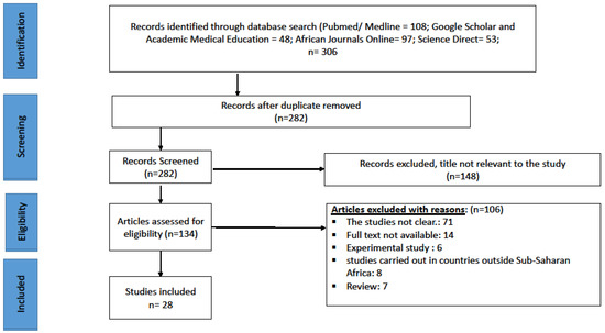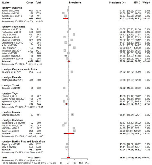 We selected 28 studies for this systematic review (Figure 1 and Figure 2). One study was conducted in Kenya [31], three in Uganda [3,32,33], one in Rwanda [34], one in Chad [35], three in Togo [36,37,38] (we included one study conducted in men as it met our eligibility criteria), one in Zambia [39], four in Zimbabwe [40,41,42,43], two in Burkina Faso [44,45] and finally 14 in South Africa [44,46,47,48,49,50,51,52,53]. It should be noted that two studies were conducted simultaneously in two countries, namely Burkina Faso and South Africa in one study and Kenya and South Africa in the other. Participants in these studies were recruited from urban and rural areas, and samples were collected and analysed in health facilities (hospital, clinic, research laboratory).