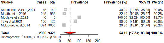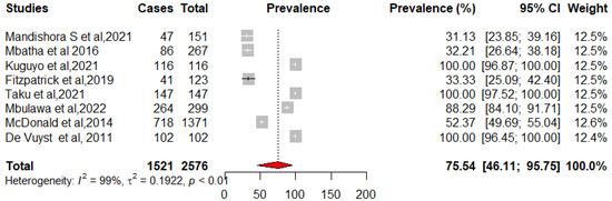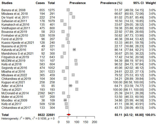 Heterogeneity between studies were estimated by I2 and H statistics [25], where I2 values indicated the degree of heterogeneity; values of 0%, 18%, 45% and 75% represented none, low, moderate and high heterogeneity, respectively [26]. Lack of evidence on heterogeneity between studies was indicated by obtaining H values close to 1, and these values were inversely correlated with the degree of heterogeneity. Prevalence, 95% confidence intervals (95% CI) and prediction intervals were estimated by random effect models [23,27]. Subgroup analyses according to country and HIV status were employed to adjust variations in the pooled estimate of prevalence. The statistical significance threshold was 0.05. The publication bias was assessed by visual inspection of the asymmetry of the funnel plot [28]. R version 3.6.0 software (packages “meta” and “metafor”) through the RStudio interface was used to perform all meta-analyses [29,30].