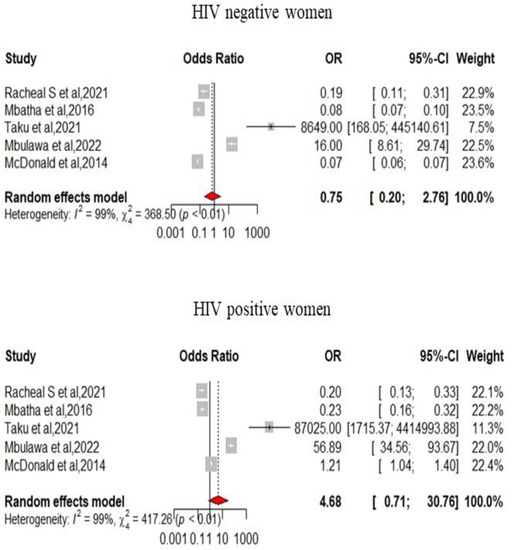 Five studies reported the rate of HPV positivity in HIV-positive and HIV-negative women respectively. In HIV-negative women, the rate of HPV positivity was 29.97% (3295/10,991), while the rate of HR-HPV positivity was 61.72% (1751/2837), with HIV-infection increasing by more than four times the risk of being infected by HR-HPV (OR = 4.68 [0.71–30.76]) (Figure 5).