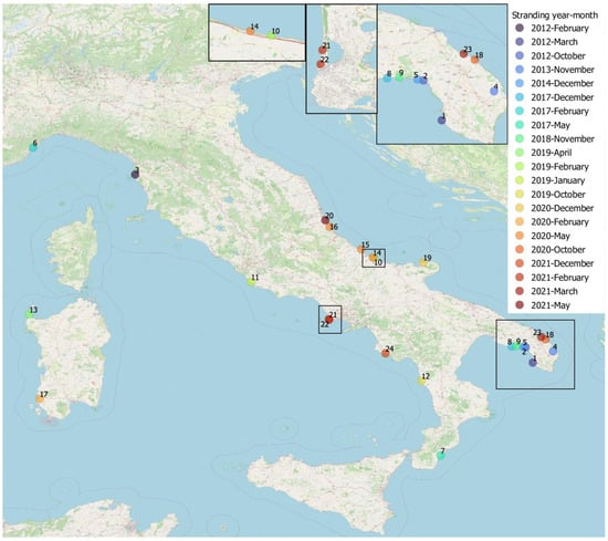 Stranding sites of striped dolphins infected by B. ceti under study, Italy, 2012–2021, by month and year of stranding. Geographical mapping was obtained by QGIS software using the geographical coordinates found from the strandings (source monitoring of cetacean strandings on Italian coasts, http://mammiferimarini.unipv.it/index_en.php, accessed on 18 May 2023). Each dot represents a stranding and is identified by the Case Id number of Supplementary Table S1. The Italy map was used under a CC BY-SA copyright from OpenStreetMap contributors (https://www.openstreetmap.org/copyright/en, accessed on 18 May 2023).