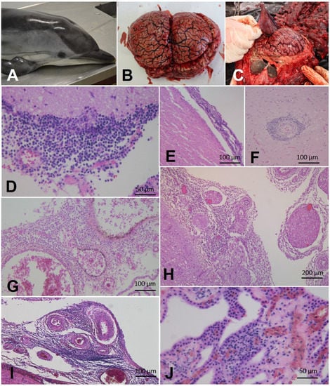 Gross and histological findings in striped dolphins (Stenella coeruleoalba) with neurobrucellosis. (A) Case 6. Dead stranded striped dolphin, presenting poor body condition. (B) Case 22. Hyperemic meninges over the cerebrum and cerebellum. (C) Case 24. Hyperemic meninges over the cerebrum. (D) Case 2. Non-suppurative meningitis. Cerebellar meninges are infiltrated by mononuclear cells 40x×. H&E. (E) Case 8. Non-suppurative meningitis. Cerebral cortex meninges are infiltrated by mononuclear cells. 10x×. H&E. (F) Case 7. Perivascular cuff characterized by the presence of lympho-monocytic cells. 20x×. H&E. (G) Case 5. Non-suppurative lympho-monocytic plexochoroiditis. 20x×. H&E. (H) Case 15. Severe non-suppurative lympho-monocytic meningitis, associated with non-suppurative periganglioneuritis 10x×. H&E. (I) Case 5. Severe non-suppurative meningitis. Meninges at the level of medulla oblongata are infiltrated by lympho-monocytic cells. 10x×. H&E. (J) Case 6. Non-suppurative lympho-monocytic plexo-choroiditis. 40x×. H&E.