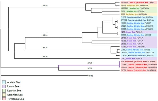 In Italy, a coinfection involving Brucella spp. was then molecularly confirmed in 2015, in a striped dolphin stranded along the Ligurian coastline, and was associated with related pathological changes in the brain, blubber, liver, and spleen []. Moreover, a B. ceti ST27 strain, previously found only in Pacific Ocean waters [,], was isolated from several lymph nodes of one bottlenose dolphin in the Croatian part of the northern Adriatic Sea, thus representing the first evidence of the spread of the strain in Mediterranean as well as in European waters [,]. The first survey of B. ceti infection in eight striped dolphins stranded along the coast of Italy from 2012 to 2018 [] showed the presence of ST26 strains in all cases, with an apparently higher occurrence of the infection along the Ionian coastline.