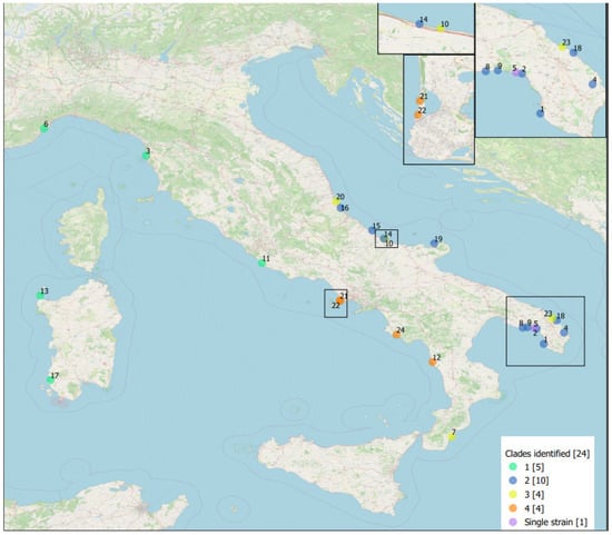 To gain proper insight into the epidemiology and the pathological features of B. ceti infection in cetaceans found stranded along the Italian coastline, we analyzed all cases of B. ceti infection detected by microbial isolation—the gold standard diagnostic test—in striped dolphins stranded between 2012 and 2021 (N = 24). We focused on the pathogenic role of the microorganism as well as on the genetic make-up of the strains involved. All strains were subjected to a comparative genomic analysis using whole genome sequencing (WGS) to characterize the fine phylogenetic relationships and infer phylogeographic distribution in dolphin populations of the Italian seas. Moreover, we aimed at determining whether different B. ceti STs are linked to specific B. ceti-associated lesions, stranding areas, age classes, and the “CeMV infection status” of the animals involved.
