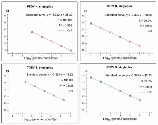 In vitro transcribed RNA samples were 10-fold serially diluted to be in the range of 106 or 107 to 10−1 copies/5 µL, and the TGEV Purdue isolate nucleic acid extract was similarly 10-fold serially diluted (from undiluted to 10−5). The dilutions were tested with optimized primer and probe concentrations in three replicate samples. For the singleplex assays targeting the PEDV S and TGEV N coding sequences, in vitro transcribed RNA of SeCoV was used and for assays targeting the TGEV S coding sequence, and the RNA extracted from the TGEV Purdue isolate was used. The RNA concentration was determined by testing a 10−4 dilution of the RNA in the TGEV N singleplex assay together with TGEV N in vitro transcribed RNA of previously determined concentrations using the standard curve.For other assays, in vitro transcribed RNA corresponding to the relevant regions of the PEDV S and N, TGEV N, and PDCoV RdRp genes were used for testing. From the data obtained, threshold limits were decided within the log phase of amplification, and RNA standards within the linear dynamic range were selected to generate the standard curves. Standard curves were used to calculate efficiency (E = 10−1/slope − 1) and RNA copy numbers in these and other runs.