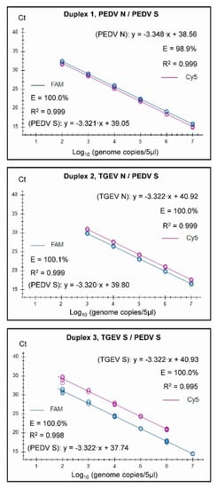 It was found that both the singleplex and duplex assays performed well, with close to 100% efficiencies, and the slopes of the curves were close to the optimal value of −3.32 (slope = −1/log10 (E + 1), i.e., when E equals 100% (or 1.00 in the formula), then the slope equals −3.32). In the Duplex 1 assay, the detection of PEDV N RNA had a slightly less than optimal efficiency of 98.9%, and a slope of −3.348 was observed. The R2 value was close to 1.00 for all of the assays, but, in the Duplex 3 and singleplex PEDV S assays, R2 was 0.998, and it was 0.995 in the Duplex 3 TGEV S. It is considered that the efficiency should preferably be in the range of 90–110%, whereas the linearity R2 values should be ≥0.98 []; thus, each of the duplex assays met these criteria. The linear dynamic ranges of the duplex assays, which were also included in the standard curves, were 102 to 107 RNA copies/5 µL (Figure 2), except for TGEV S in Duplex 3, where the linear range was 102 to 106 RNA copies/5 µL. Similarly, the RT-qPCRs in the triplex assay had a high efficiency (99.8–103%) and a R2 value close to 1.00 (0.997–0.999) for each target within both singleplex and triplex formats (see Figure 3). The assays had a linear dynamic range of between 102–107 copies for the PDCoV and PEDV (singleplex) and PEDV (triplex) assays, whereas it was between 103–107 copies for the TGEV (singleplex) and for PDCoV and TGEV in the triplex assays.
