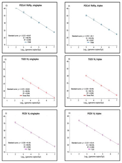 Singleplex and triplex standard curves generated on the basis of serially diluted RNA standards in three replicates. In vitro transcribed RNA was used for the standards for PDCoV RdRp, for TGEV N, and for PEDV N. Standard curves were generated for the data points within the linear dynamic range. Efficiency (E) was calculated automatically from the standard curve by the Bio-Rad CFX Maestro 1.1 program.