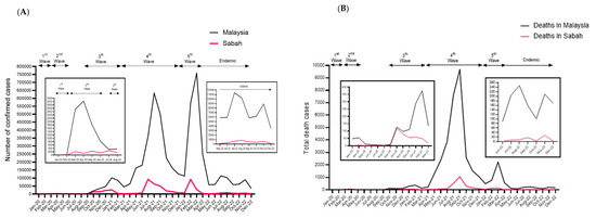 Epidemiology of COVID-19 in Malaysia and Sabah as of 31 December 2022. (A) Number of confirmed COVID-19 cases in Malaysia and Sabah. (B) Number of confirmed COVID-19 death cases in Malaysia and Sabah. Studied period: March 2020 to December 2022.