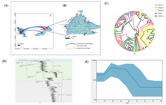 According to phylogeographic analysis, the COVID-19 outbreak in Sabah started in the Tawau district (Figure 4A) and the origin of the virus was traced to Peninsula Malaysia, which served as the epicentre of transmission in early March 2020. Subsequently, the virus spread to other regions of Sabah and Kota Kinabalu, becoming the second most infected district and spreading the virus to other parts of Sabah (Figure 4B). Based on the Time-Scaled MCC cladogram, the first Sabah SARS-CoV-2 is shown to have originated in Peninsular Malaysia. However, the basal position is known to have originated in Indonesia. Then, the tree split and contributed to the spread to other countries such as Brunei, the Philippines and Singapore (Figure 4C). The estimated mean of tMRCA of the Sabah SARS-CoV-2 isolate was 94 days (95% high posterior density (HPD): 82.5–154.3), corresponding to the haplotype of the outbreak in Wuhan, China, on 26 November 2019 (HPD 95%: 23 October 2019–24 December 2019) (Figure 4D). The root of the Alpha clade was dated back to 23 January 2020 (HPD 95%: 19 December 2019–18 February 2020) and the Beta and Delta clades to 13 April 2021 (HPD 95%: 5 March 2021–22 May 2021). All Omicron variants in the phylogenetic tree (Figure 4D) were dated back to 3 January 2022 (HPD 95%: 15 December 2021–21 February 2022). The population dynamics of SARS-CoV-2 were plotted using Bayesian Skyline Plot in March 2020, which showed a sigmoidal type of distribution with exponential growth was noticed at the beginning of March 2020 and started to reduce in April and plateaued in May 2020 (Figure 4E).
