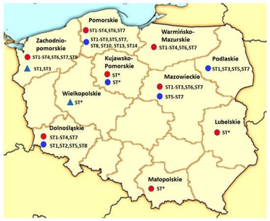 Figure 1 shows a map of Poland with sampling sites and the Blastocystis subtypes identified in these regions in humans, animals, and water and water organisms.