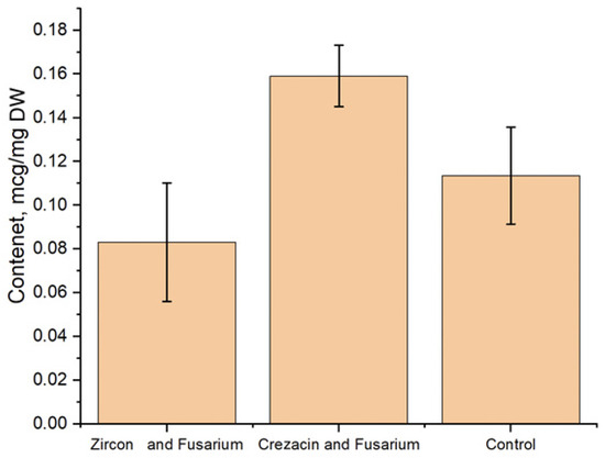 Compared to the control (no treatment, no infection), the content of proline in the seedlings grown from seeds of plants treated with Crezacin increased to 0.16 µg/mg. The content of free proline in seedlings of the "Zircon" variant was 0.08 μg/mg, which was comparable with the control (0.11 μg/mg). Data showing an increase in the content of free proline and other free amino acids in cereals infected with fungal pathogens are available. After the plant inoculation with F. culmorum spores, the accumulation of free amino acids increased by 30–50% compared to the control. The use of biostimulants also increased in the level of proline and other amino acids, though to a lesser extent (3–33%) compared to the control. [46].