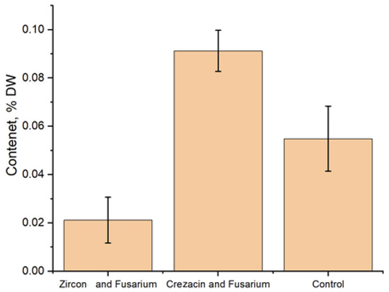 The content of low-molecular fructose in the studied plant samples is shown in Figure 3. In both variants of treatment, the obtained results significantly differed from the control. In the case of seedlings grown from seeds of Crezacin + Fusarium-treated plants, the value of this parameter was 66.3% higher than in the control. In the case of seedlings of the Zircon + Fusarium variant, a decrease by 61.6% of the control was observed.