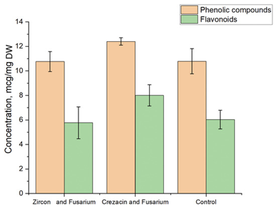 The content of phenolic compounds and flavonoids in oat seedlings grown from seeds of plants treated with Crezacin and Zircon and artificially infected with Fusarium fungi is shown in Figure 4. The treatment with Crezacin resulted in an increase in the content of phenolic compounds and flavonoids compared to the control. No significant differences were observed between the control and Zircon-treated samples.