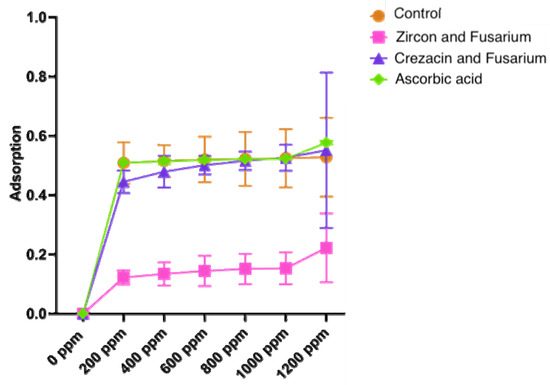 The total ferric reducing power of different variants of oat extracts taken in different concentrations (0–1200 ppm). Ascorbic acid was used as the reference antioxidant. The total ferric reducing power was determined by the transformation of ferric ions (Fe3+) to ferrous ions (Fe2+). The reducing power estimation was based on the absorbance at 700 nm. The values are expressed as mean ± standard deviation of three replicates. The extract from untreated noninfected plants was used as the control.