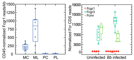 Our long-term project is a characterization of the strategies that P. leucopus deploys to thrive in its environment, all the while infected with one or more microbes that cause disease in humans and laboratory mice. In pursuit of this goal, we compared P. leucopus and M. musculus for their transcriptional responses in the blood, spleen, and liver to the endotoxin lipopolysaccharide (LPS) from the Gram-negative bacterium Escherichia coli [11,12]. There were hundreds of differentially expressed genes (DEG) between LPS-treated and control animals. Among the DEGs distinguishing deermice and mice in their responses to LPS was Fcgr1, the gene for high-affinity immunoglobulin gamma Fc receptor I (FcγRI), also known as CD64 [11]. Fcgr1 increased in transcription in the blood, spleen, and liver of M. musculus after LPS injection. In contrast, there were few, if any, transcripts corresponding to the locus annotated as Fcgr1 in P. leucopus under either condition in blood or either organ. FcγRI has plausible relevance for infection tolerance phenomenon; mice with knockouts of this gene display less inflammation than wildtype mice in different disease models [13,14]. In addition, there may be a non-canonical relationship between this protein and B. burgdorferi; Carreras-González et al. reported a direct interaction between FcγRI on mouse macrophages and B. burgdorferi in vitro without the requirement of opsonizing antibody [15].