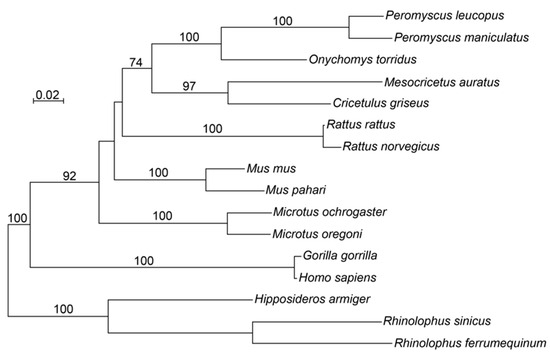 Four exons, arrayed in the order of 539, 261, 696, and 77 bp in length, were identified in the predicted mRNA of 1573 nt of XM_037207305.1. These exons encode a predicted protein of 458 amino acids (XP_037063200). Using this protein sequence for a blastp search (https://blast.ncbi.nlm.nih.gov, accessed on 4 August 2022), we found that the only proteins in GenBank with 55% or greater identity for over 55% of their lengths were FcγRI proteins of other rodents, including the golden hamster Mesocricetus auratus, M. musculus, and Rattus norvegicus. Alignment of the deduced protein sequence of P. leucopus with selected other rodents, as well as two primates and three Microchiroptera bats, showed that beginning with residue 33 of the P. leucopus sequence, it was homologous, with identities of >72% and few if any gaps, to corresponding fragments of FcγRI proteins of other rodents (Figure S1). The phylogram of Figure 2 of the aligned sequences after position 32 shows P. leucopus in a cluster with P. maniculatus and the cricetines M. auratus, the Chinese hamster Cricetulus griseus, and the southern grasshopper mouse Onychomys torridus, a topology that recapitulates other phylogenies for rodents [24].