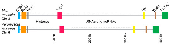 Schematic physical map of Fcgr1 gene locus regions of chromosome (Chr) 3 of M. musculus and chromosome 6 of P. leucopus with the locus for Fcgr1 (red). Other genes, their approximate sizes, and their positions are indicated. Regions rich in histones and histone-type genes or in tRNAs and non-coding RNAs (ncRNAs) in both animals are denoted. The ruler of lengths is at the bottom.