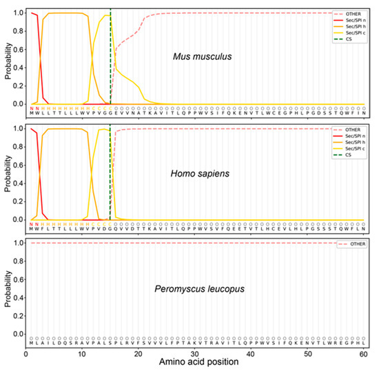 We could not completely exclude expression of the predicted coding sequence under some condition not examined here. If this could occur, might the expressed protein be functional? The upper panel of Figure 4 is an alignment of the N-terminal ends of the deduced protein sequences for FcγRI or FcγRI-like proteins of P. leucopus, P. maniculatus, O. torridus, the prairie vole Microtus ochrogaster, Me. auratus, C. griseus, R. norvegicus, M. musculus, the Chinese rufous horseshoe bat Rhinolophus sinicus, and Homo sapiens. From amino acids 1 through 32, the predicted proteins of P. leucopus and P. maniculatus are unlike the proteins of the other mammals in the set. What serves as the signal peptide for the other proteins would be replaced in these two Peromyscus proteins by an N-terminal sequence that is not predicted to function as a signal peptide (Figure 4 lower panel). This stands in contrast to the N-terminal amino acid sequences of the M. musculus and H. sapiens proteins, which were accurately predicted as signal peptides. Therefore, even if the putative coding sequence was transcribed and translated, we would not expect that product to be transported and then positioned in the membrane to function as a receptor.