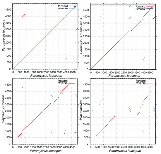 Since it was possible that the rearrangement or deletion in P. leucopus was limited to the LL stock population, a breeding colony which had been closed since the 1980’s, we determined the sequences of the corresponding region of an animal drawn from the inbred strain GS16A1 population of P. leucopus, which was started in the 1960’s from animals captured in Illinois, an animal of an outbred closed colony derived from wild population of New York, and a wild animal from a population in Connecticut [27]. The sequences were 96–97% identical to that for the LL stock reference. Similarly, the corresponding sequence on scaffold JAOPKW010000002 of a P. maniculatus sonoriensis was 98% identical to that of the reference genomes of P. maniculatus bairdii and P. polionotus, the oldfield deermouse, and closely related to P. maniculatus [24].