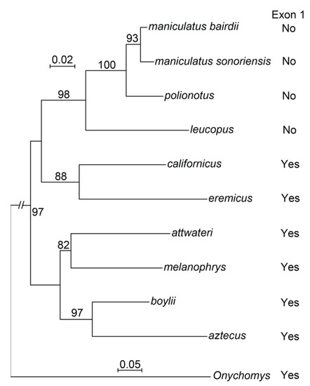 - Bradley, R.D.; Durish, N.D.; Rogers, D.S.; Miller, J.R.; Engstrom, M.D.; Kilpatrick, C.W. Toward a molecular phylogeny for Peromyscus: Evidence from mitochondrial cytochrome-b sequences. J. Mammal. 2007, 88, 1146–1159. [Google Scholar] [CrossRef]
