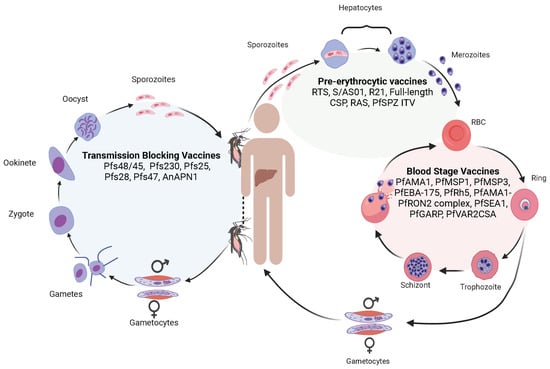 The life cycle of malaria parasites, with major vaccine candidates targeting different developmental stages. The malaria life cycle starts with a mosquito bite injecting sporozoites into the human skin. The sporozoites travel to the bloodstream to invade hepatocytes, where the parasites replicate to produce thousands of merozoites. Some vaccines targeting the liver-stage parasites include RTS,S/AS01, R21, full-length circumsporozoite protein (CSP), radiation-attenuated sporozoites (RAS), and PfSPZ immunization–treatment–vaccination (PfSPZ ITV). Mature merozoites from the liver are then released into the bloodstream again to invade RBCs. Within an RBC, the parasite replicates to produce more merozoites that can invade new RBCs for additional cycles. Some vaccines targeting the P. falciparum blood stages include apical membrane antigen 1 (PfAMA1), merozoite surface protein (PfMSP1), PfMSP3, erythrocyte-binding antigen 175 (PfEBA-175), reticulocyte-binding protein homolog 5 (PfRh5), AMA1-rhoptry neck protein 2 (PfAMA1-PfRON2) complex, schizont egress antigen-1 (PfSEA1), glutamic-acid-rich protein (PfGARP), and erythrocyte membrane protein-binding chondroitin sulfate A (PfVAR2CSA). For unknown reasons, some merozoites may develop into male and female gametocytes that differentiate into male and female gametes in the mosquito midgut when another mosquito takes a blood meal. The male and female gametes fertilize to form zygotes that differentiate into motile ookinetes. The ookinetes penetrate the mosquito midgut and develop into oocysts outside the midgut wall. Each oocyst contains thousands of sporozoites that travel to mosquito salivary glands. Transmission-blocking vaccines are aimed at blocking the development of sexual stages within mosquitoes. Vaccines targeting these stages include Pfs48/45, Pfs230, Pfs25, Pfs28, Pfs47, and anopheline alanyl aminopeptidase N (AnAPN1) which is a mosquito midgut protein. When the mosquito bites another vertebrate host, the sporozoites are injected into the new host, starting another cycle.