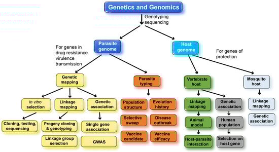 Summary of major approaches and applications in genetic and genomic studies of malaria parasites. Many genetic and genomic approaches have been employed to study the malaria parasite populations, transmission, molecular evolution, drug resistances, host–parasite interaction, and vaccine targets. Genetic crosses can be performed using different strains of malaria parasites to map parasite genes conferring drug resistance or encoding vaccine targets. Similarly, genetic crosses of inbred mice will allow the mapping of host-protective genes. DNA collected from patient blood samples can be used in association studies, either using a single candidate gene or genome-wide association study (GWAS), to identify parasite and host genes of interest and/or to study parasite population structure, origin, molecular evolution, and drug-selective sweeps. Using animal models, it is also possible to study host–parasite genetic interactions, linking host gene response/expression to parasite genes using trans-species expression quantitative locus analysis (ts-eQTL) [4]. When identifying drug-resistant genes, parasites can be selected under drug pressure in vitro (P. falciparum) or in vivo (rodent Plasmodium species), and genome sequences from the parasites before and after selection can be compared to identify mutations selected using drug treatment. Similar genetic approaches have also been employed to map mosquito genes conferring resistance to malaria infections.