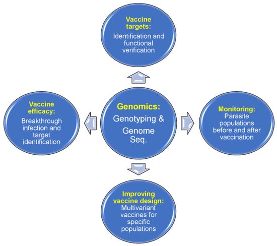 There are many malaria vaccines under various stages of development. Malaria vaccines can be divided into three major categories on the parasite developmental stages, including pre-erythrocytic vaccines (anti-liver stages), blood-stage vaccines, and transmission-blocking vaccines (anti-sexual stages) (Figure 1). Among the vaccines against each stage, there are single-molecule or multiantigen vaccines, multistage vaccines, and whole-organism-based vaccines [87,88,89,90,91,92,93,94,95]. The most successful malaria vaccine against P. falciparum parasites developed so far is the RTS,S/AS01 which consists of 18 copies of the central repeat and the C-terminal domain of PfCSP fused to the hepatitis B virus surface antigen (HBsAg) [93,94]. The RTS,S vaccine has been recommended for human use by the WHO [95]. However, a sterile malaria vaccine (or 100% protection) is not available currently; more research and development are required to achieve the goal of eradication of malaria through vaccination. Genetic and genomic tools have the potential to contribute significantly to the development of an effective malaria vaccine, providing information for the identification of vaccine targets, improving vaccine design, evaluating vaccine efficacy, and monitoring potential vaccine “resistance” or escape (Figure 3).