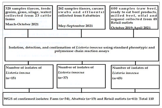 All 110 isolates of L. innocua were previously identified (bacteriological and multiplex PCR) as L. innocua as described [40,41]. The confirmed isolates of L. innocua were inoculated in 50% brain heart infusion (BHI)/50% glycerol and stored at −20 °C until subjected to whole genome sequencing (WGS) analyses. The number of isolates of L. innocua used in this study was 110 (11.1%) from 990 samples. The prevalence of L. innocua in the three beef industries was 10.4% (34/328), 5.7% (15/262), and 15.3% (61/400) for cattle farms, beef abattoirs, and retail outlets, respectively. The current study assessed all the isolates, their origin (three industries: cattle farms, abattoirs, and retail), and the types of samples.