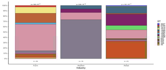 Frequency of L. innocua sequence types by industry. Significant associations for each industry based on the ST detected were found, and the associated p-values are presented above the bar plot. Overrepresentation of ST637 and ST1482 was seen in the farming industry, whereas ST537 was found to be significantly abundant in the abattoirs. In the retail industry, ST448, ST637, and ST1085 were found more frequently than expected.