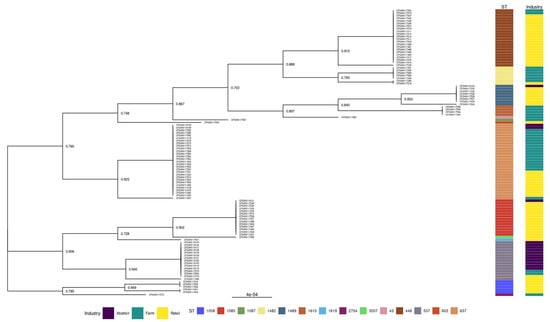 Phylogenetic tree of the 110 recovered isolates across the three industries. The first color map indicates ST, and the second indicates the industry related to the isolate. Bootstrap values are indicated and are high across the tree. Groupings based on ST are evident in the sequential colors in the first color map. associated industry in the second color map indicates a propensity for STs in certain industries.